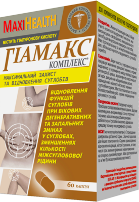 Диетическая добавка Гиамакс комплекс восстанавливает функцию суставов при возрастных дегенеративных и воспалительных изменениях и сниженном количестве межсуставной жидкости