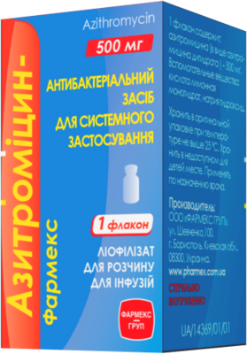 ФОРМА ВЫПУСКУ: Флакони . Ліофілізат для приготування розчину для інфузій. 1 флакон містить 500 мг азитроміцину (у вигляді азитроміцину дигідрату)